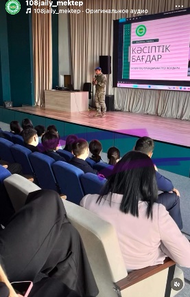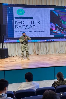 Сәрсенбі – кәсіптік бағдар беру күніне орай, мектебімізге Әскери маман, үлгілі отбасы иесі – аға офицер, «А» арнайы бөлімінің қызметкері Курмангазин Рүстем Хамитұлы шақырылып, оқушылармен кездесу ұйымдастырылды. Әскери саладағы қызмет әсіресе ер балаларға қызықты болды. Көкейлерінде жүрген сауалдарын қойып, көп деректермен танысты.